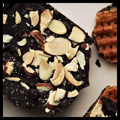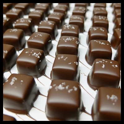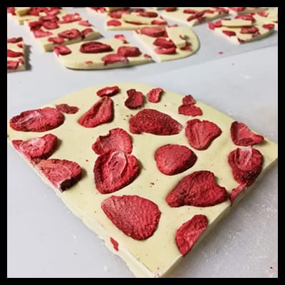 We carry their strawberry bark, toffee cracker crunch, and coconut caramels, as well as limited edition candies, and some pairs of clay earrings